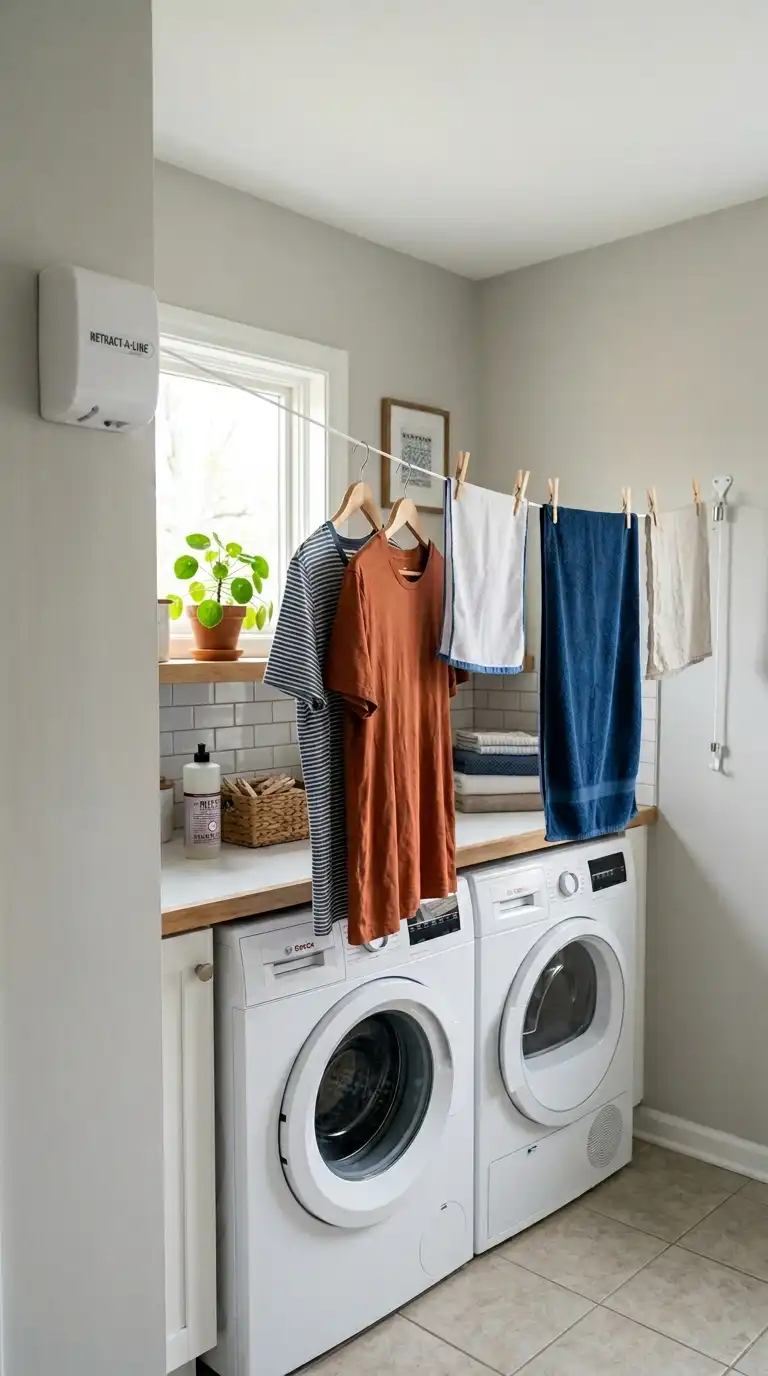 A retractable clothesline is the ultimate space-saver. Mount the housing on one wall and pull the line across to the opposite wall or a hook. When not in use, the line retracts completely into the housing. Some models have multiple lines for more drying capacity. This is ideal for narrow laundry rooms or outdoor covered patios.