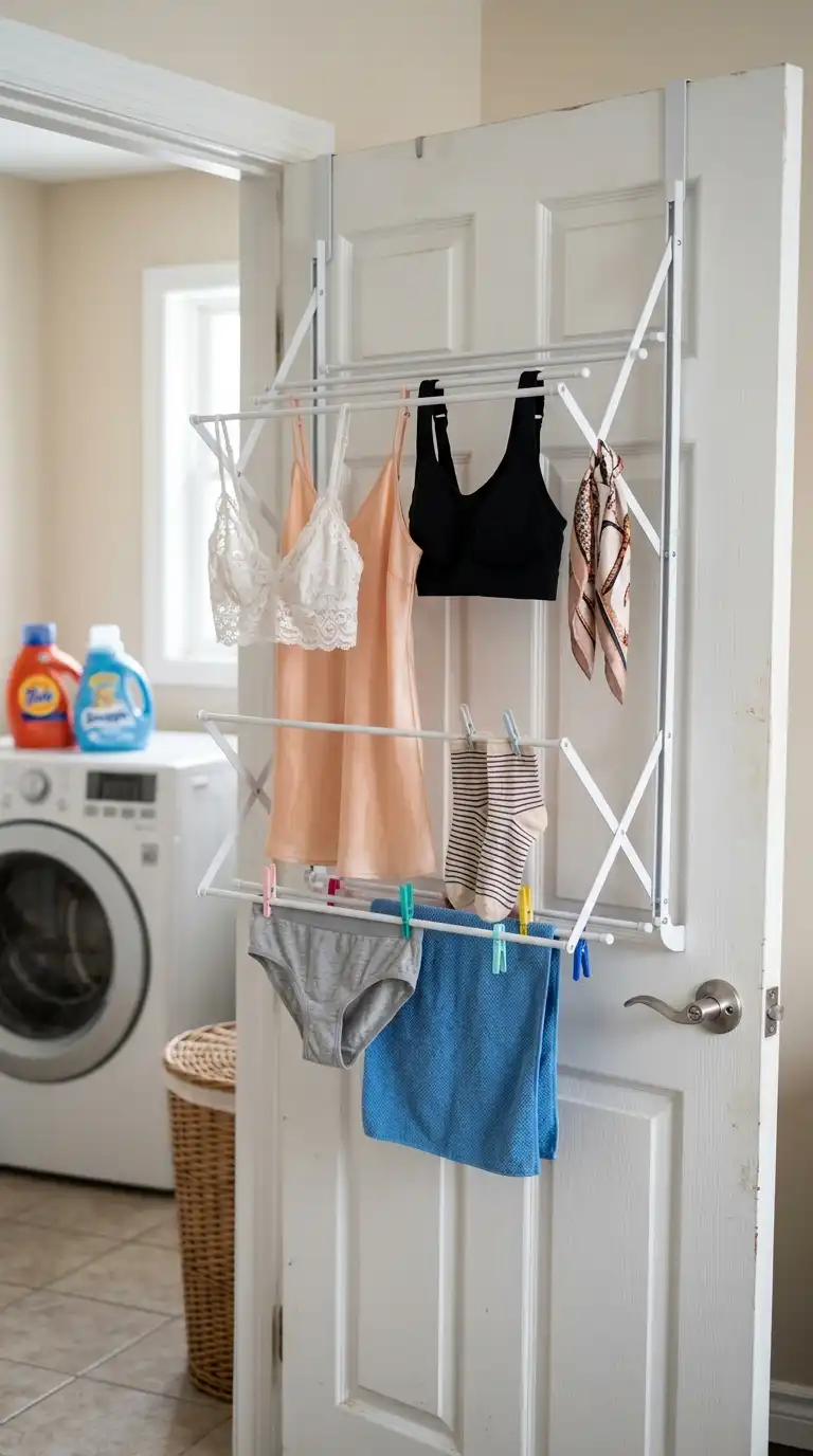 Use the back of a door for drying space. Hang an over-the-door drying rack with multiple folding arms. When not in use, the arms fold flat against the door. This is perfect for small bathrooms, laundry closets, or apartments where wall space is limited.
