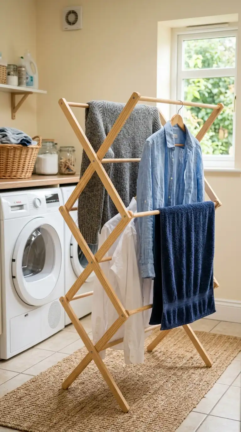 A classic freestanding wooden drying rack is both functional and attractive. When not in use, it can be folded flat and stored behind a door or in a closet. Look for a rack with a natural wood finish that complements your decor. Use it for sweaters, delicates, and hand-washed items.