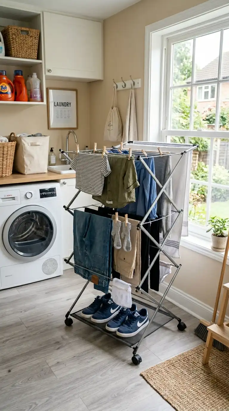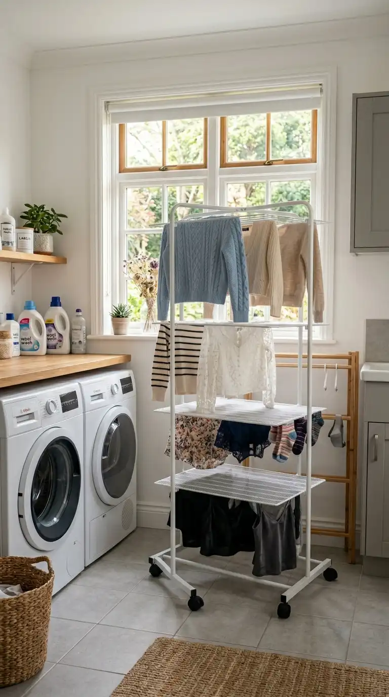 A drying rack on wheels can be moved wherever you need it. Roll it to the washer to load, then roll it to a sunny window or a warm spot to dry. When not in use, roll it into a closet or corner. Some models are collapsible for easy storage.
