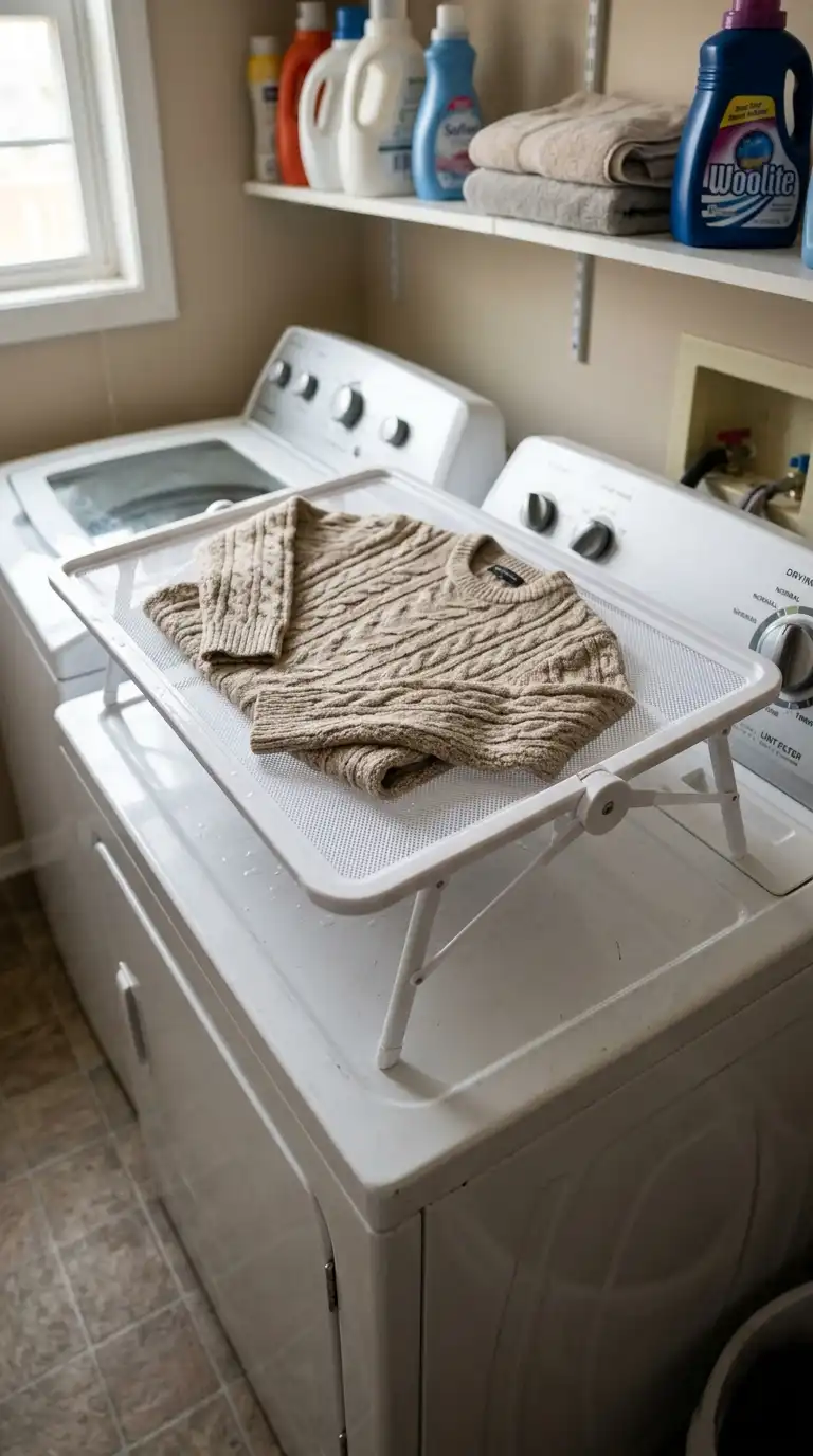 A mesh shelf drying rack is designed for laying flat delicate items like sweaters, bras, and hand-washed knits. The mesh allows air to circulate while preventing stretching. Some models are freestanding, while others are designed to sit on top of a washer or dryer.