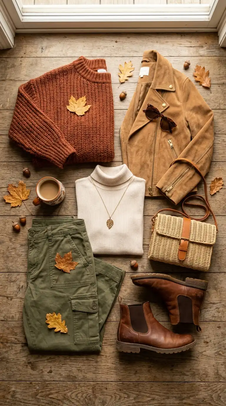 Rust and olive are quintessential fall colors that bring warmth and richness to any wardrobe. The combination of deep, earthy tones creates a palette that feels both vibrant and grounded. Key pieces include a rust-colored sweater, olive green cargo pants, a cream turtleneck, and a tan suede jacket. This capsule celebrates the colors of changing leaves and pairs beautifully with natural textures like leather, suede, and wool.