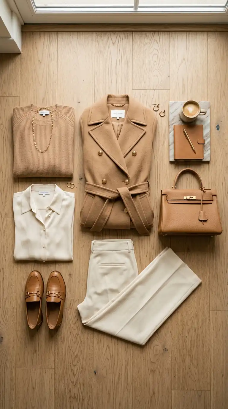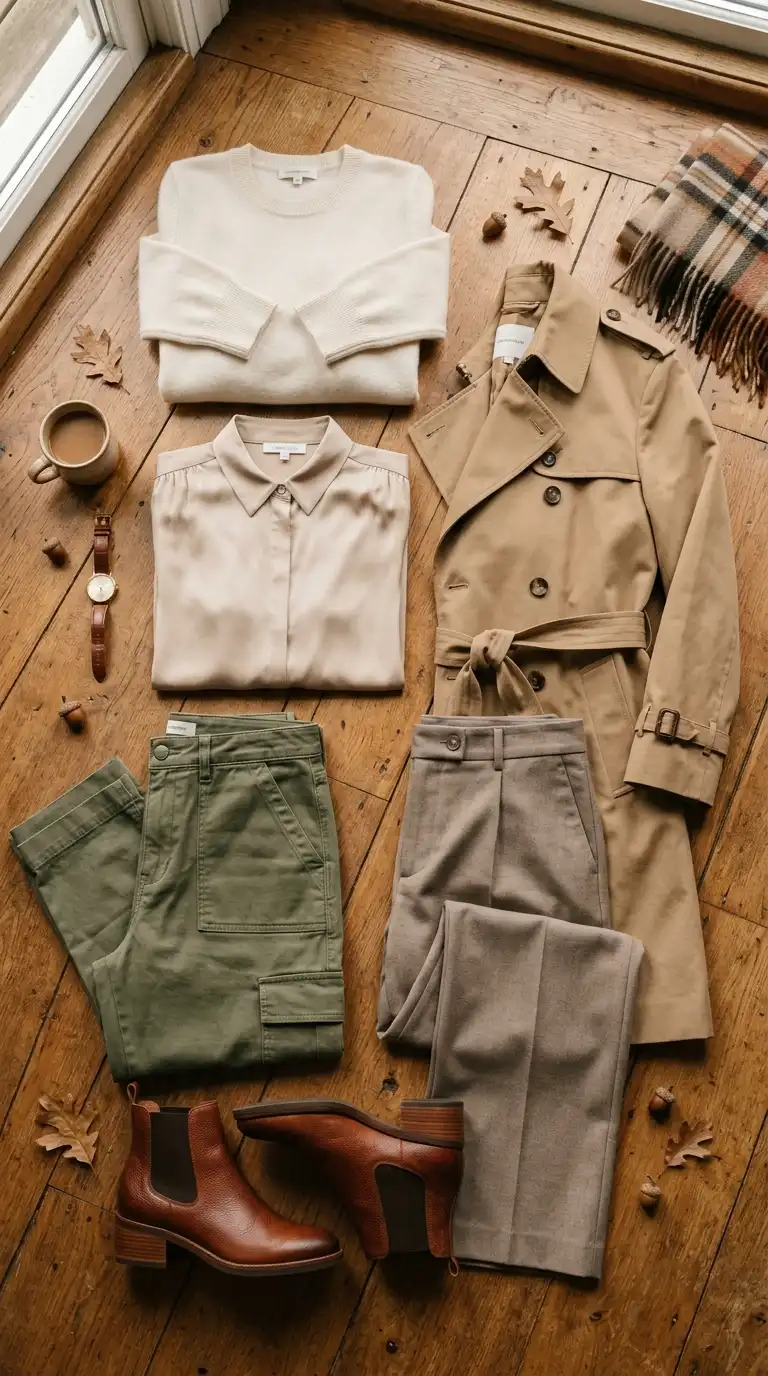 The earthy neutrals capsule captures the essence of autumn with a palette of camel, cream, olive, taupe, and warm gray. These colors work harmoniously together, creating a serene, sophisticated wardrobe that feels grounded and timeless. Key pieces include a cream cashmere sweater, olive utility trousers, a camel trench coat, and taupe wide-leg trousers. This capsule is ideal for those who prefer understated elegance and pieces that transition seamlessly from work to weekend.