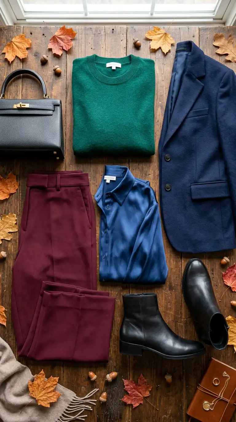 Fall is the perfect season to embrace deep jewel tones—emerald green, sapphire blue, burgundy, and amethyst. These rich, saturated colors add drama and luxury to a fall wardrobe. Key pieces include an emerald green sweater, burgundy wide-leg trousers, a navy blazer, and a sapphire silk blouse. This capsule is ideal for those who love bold color and want to make a statement while maintaining versatility.