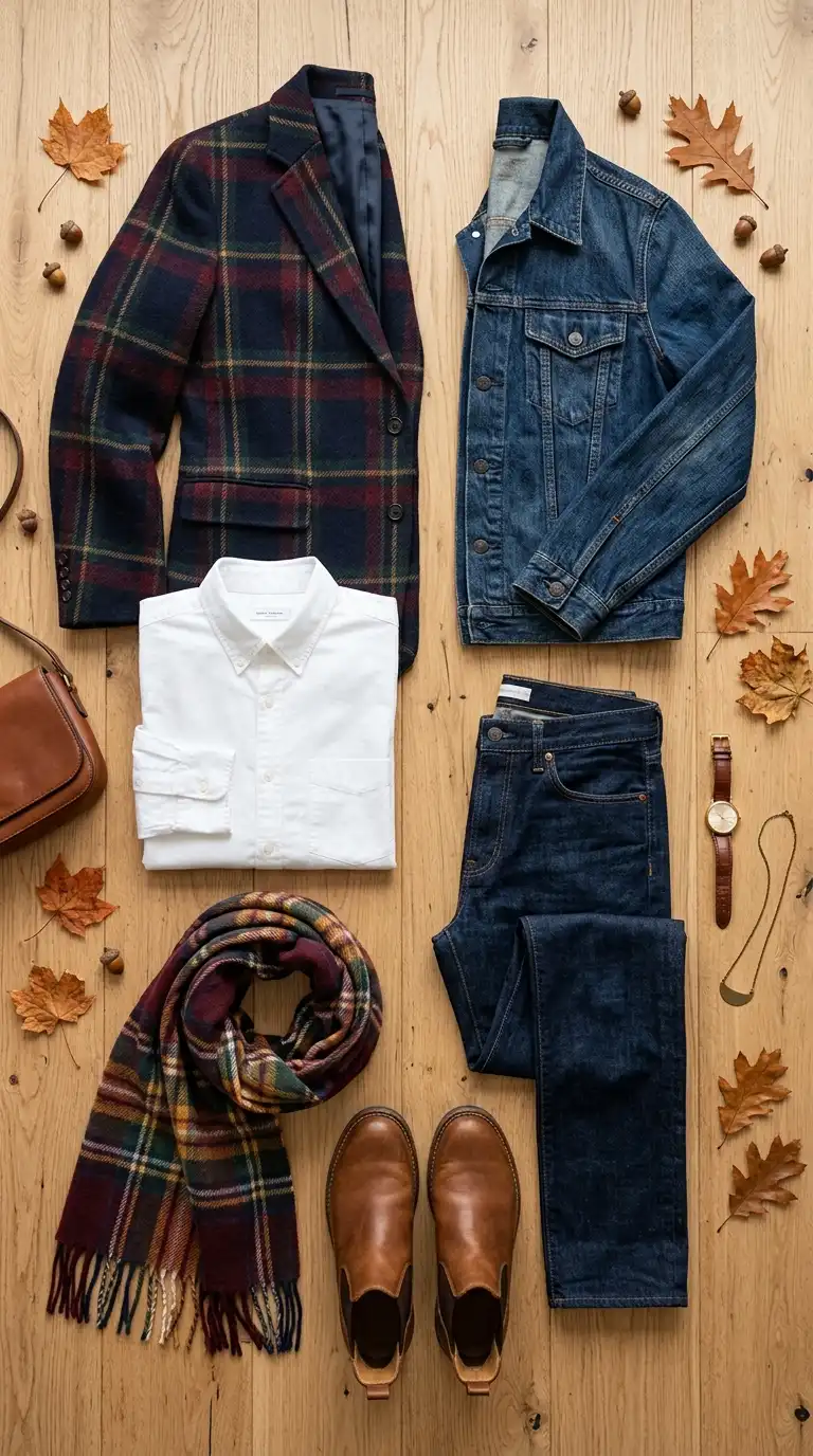Plaid is a quintessential fall pattern that adds instant seasonal charm. Pair plaid pieces with classic denim for a timeless, casual look. Key pieces include a plaid blazer, a plaid scarf, dark wash jeans, a white button-down shirt, and a denim jacket. This capsule celebrates heritage style and is perfect for weekends, casual outings, and cozy days.