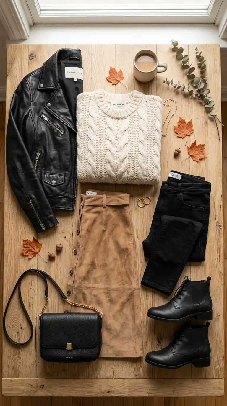 The combination of leather and knits creates a balanced fall wardrobe that is both edgy and cozy. Key pieces include a black leather jacket, a cream chunky knit sweater, black slim-fit trousers, and a tan suede skirt. This capsule celebrates texture and contrast, with pieces that can be dressed up or down. The leather adds edge while the knits provide warmth and softness.