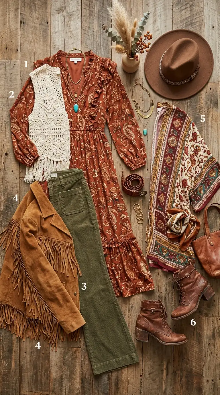 The bohemian fall capsule embraces pattern, texture, and free-spirited style. Key pieces include a floral maxi dress, a crochet vest, wide-leg corduroy trousers, a fringed suede jacket, and a patterned kimono. The palette includes warm earth tones—terracotta, rust, olive, and cream—with mixed patterns and textures. This capsule is for those who love creative expression and a relaxed, layered aesthetic.