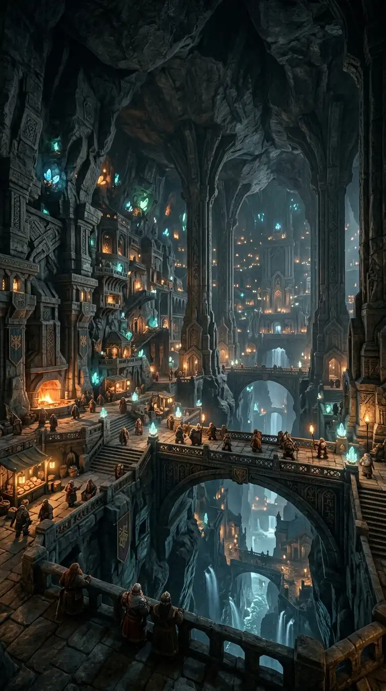 The underground dwarf city is carved into a mountain. Great halls are carved from stone. Pillars rise like trees. Bridges span chasms. The city is lit by glowing crystals. The underground dwarf city is subterranean, monumental, and carved.