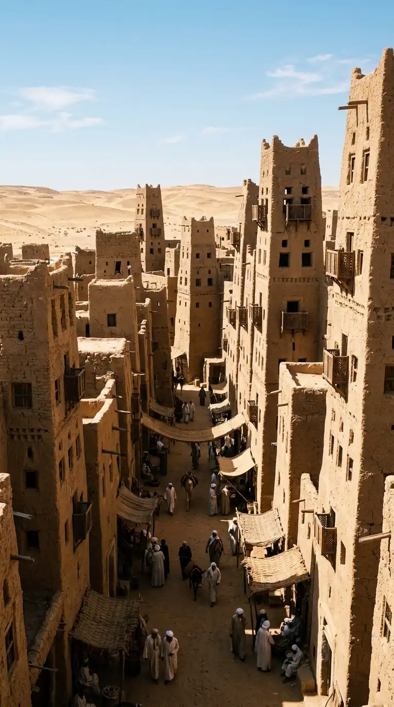The desert city is built of sandstone and mud brick. The city rises from the desert. Towers are tall and slender. Windows are small. The city is shaded and cool. The desert city is earthy, vertical, and shaded.