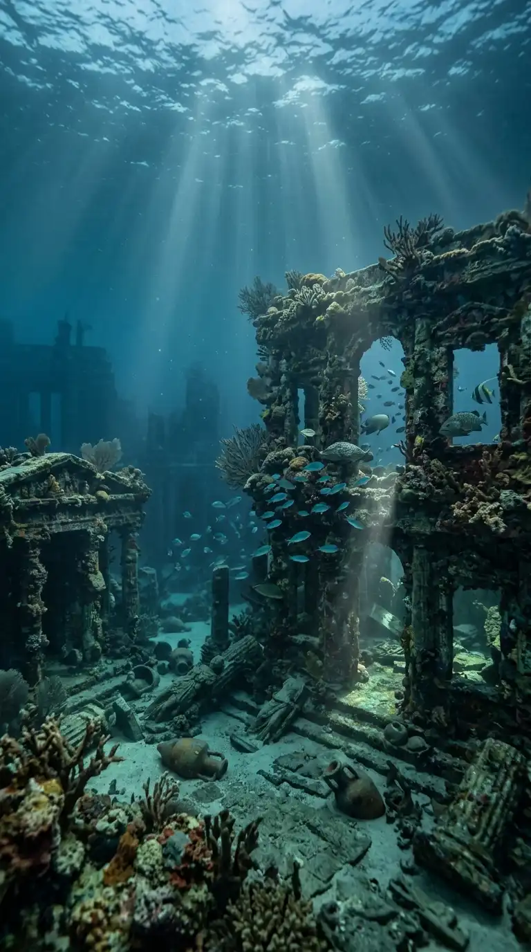 The sunken city is beneath the waves. Buildings are encrusted with coral. Fish swim through windows. Light filters from above. The sunken city is aquatic, ruined, and mysterious.