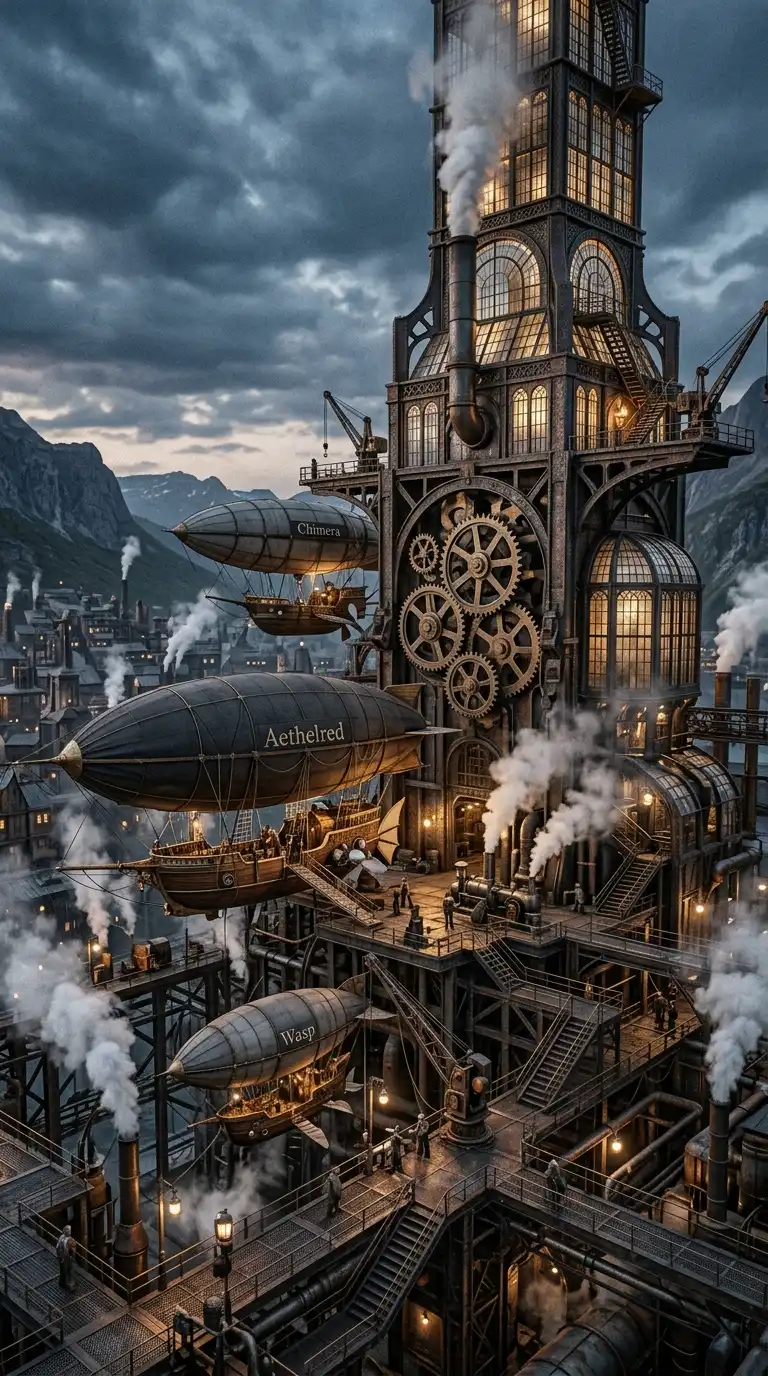 This design is ideal for steampunk cities and airship ports. The emotional effect is industrial, vertical, and mechanical.