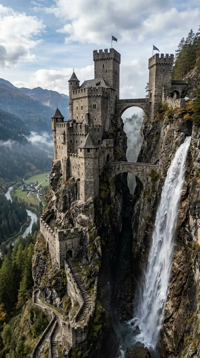 The cliffside castle is built into a sheer rock face. The castle clings to the cliff. Towers rise from the rock. Bridges connect towers. The castle is defensible, dramatic, and impossible. The cliffside castle is vertical, defensive, and dramatic.