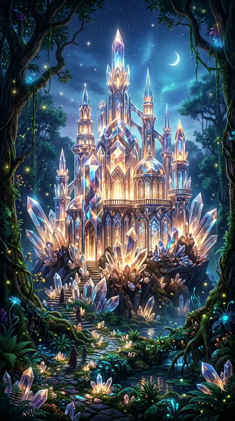 The crystal palace is built of giant crystals. The crystals grow from the ground. They are faceted and glowing. Light refracts through the crystals. The crystal palace is crystalline, glowing, and magical.