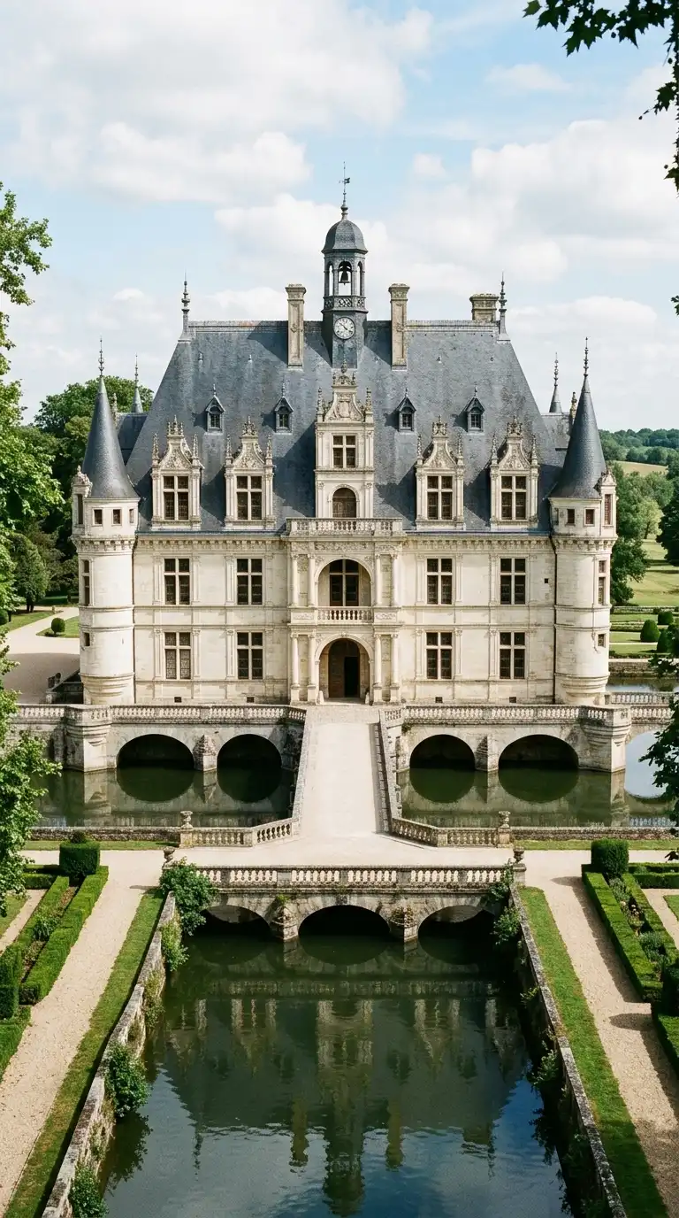The château is a French country house or palace. The Renaissance château is symmetrical, with a central staircase, high roofs, and elaborate dormers. The château is often surrounded by a moat or garden. The château is elegant, symmetrical, and aristocratic.
