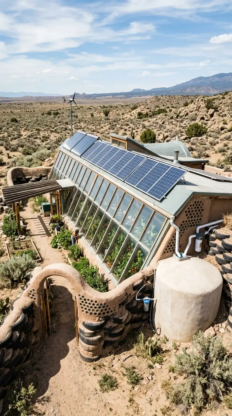 The Earthship is a passive solar house made of recycled materials — tyres, cans, bottles. The tyres are rammed with earth to create thermal mass walls. The bottles and cans are set in concrete for non-structural walls. The Earthship collects its own water, treats its own waste, and generates its own power.