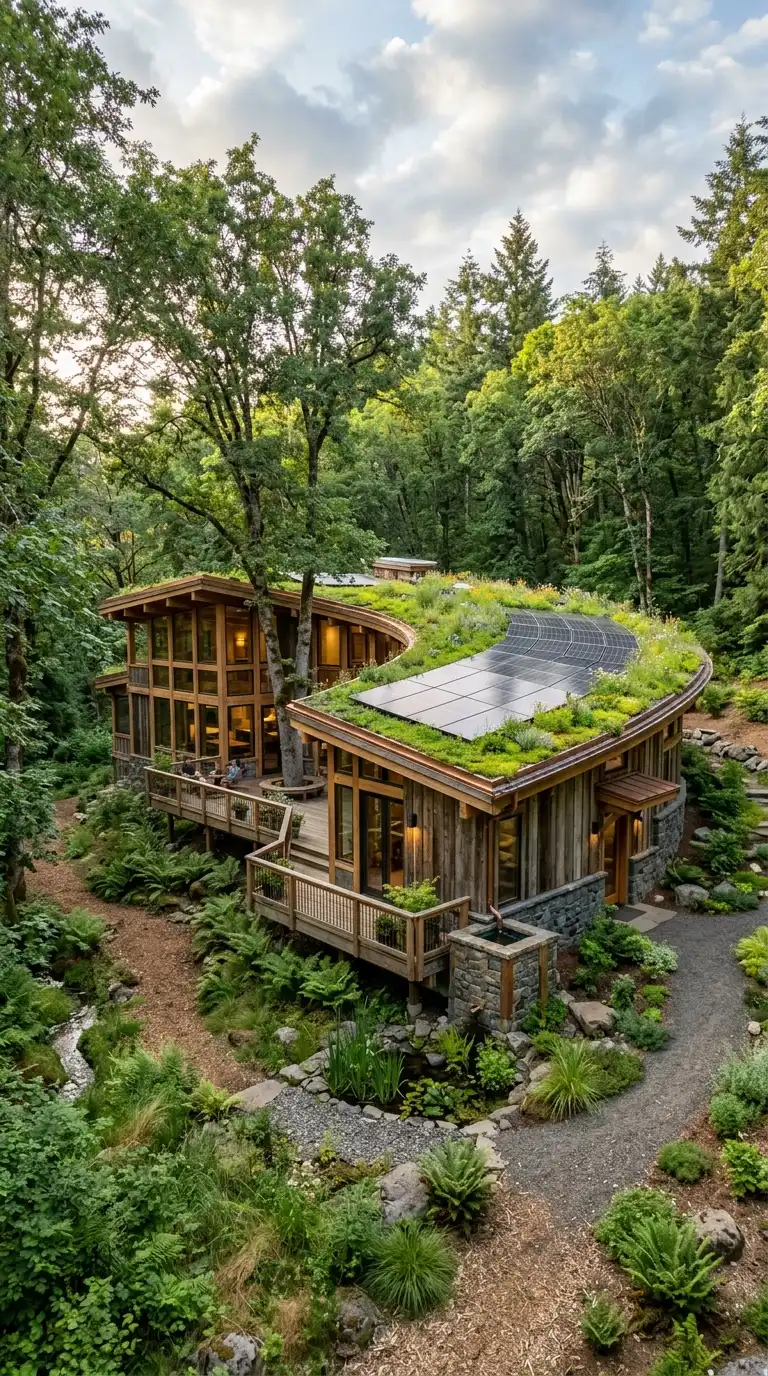 This design is ideal for sloped sites and extreme climates. The emotional effect is protected, mysterious, and deeply grounded.
