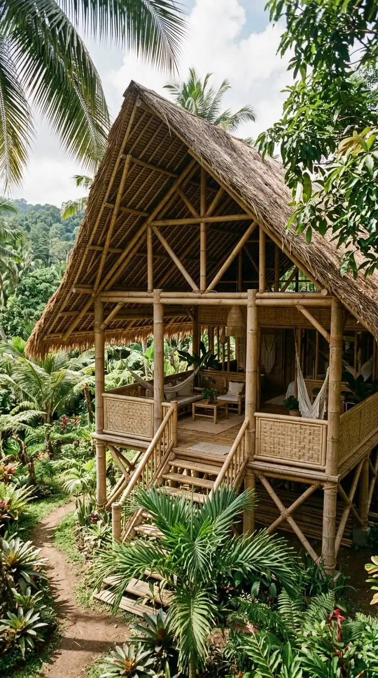 Bamboo is a rapidly renewable material — it grows up to one metre per day. Bamboo is strong, lightweight, and flexible. Bamboo houses are common in tropical Asia and South America. The bamboo is treated for durability and formed into beams, columns, and trusses.