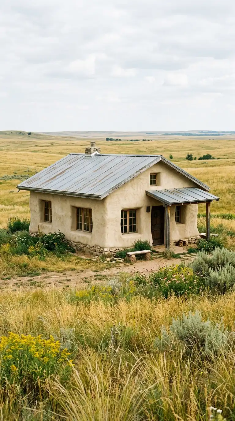 The straw bale house uses bales of straw as insulation and structure. The bales are stacked like bricks, then plastered with clay or lime. The walls are thick (45-60cm) and highly insulating. Straw is a renewable agricultural waste product.