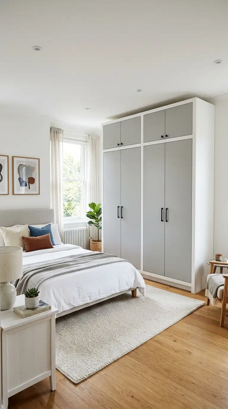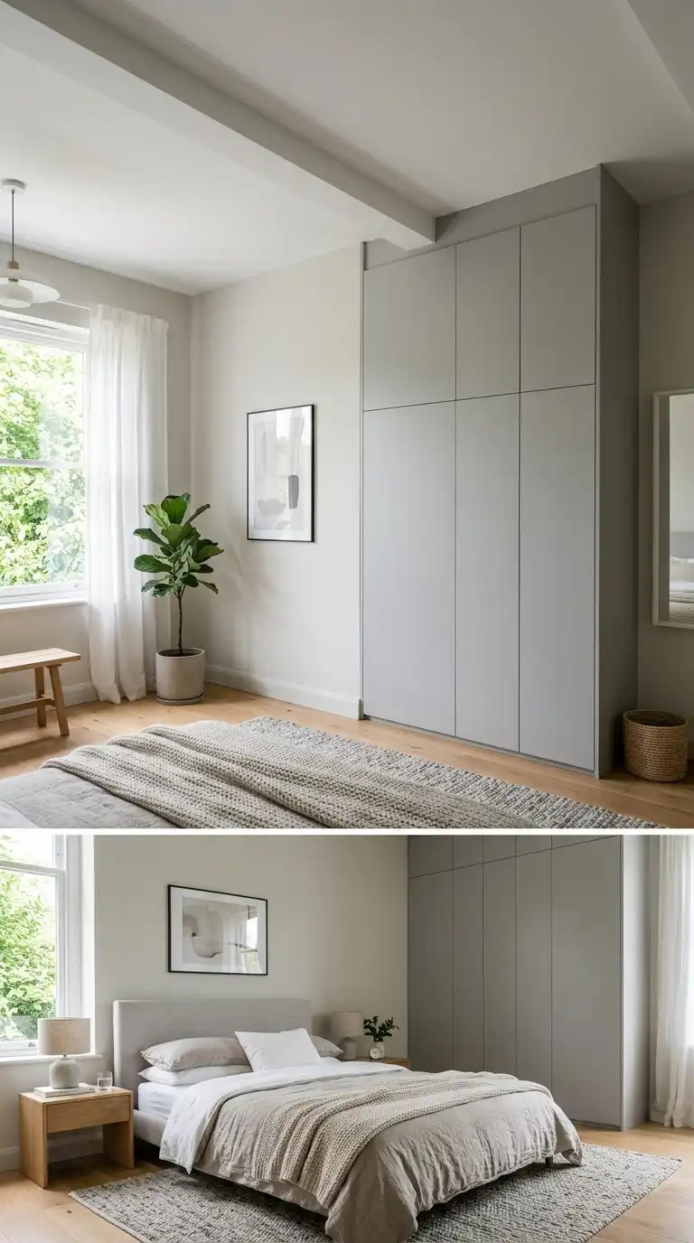 A dove grey matte finish creates a soft, serene backdrop for a bedroom. The light grey is calming and versatile, pairing well with white, wood, and pastel accents. Use handleless doors for a clean, minimalist look, or add slim hardware for subtle detail.
