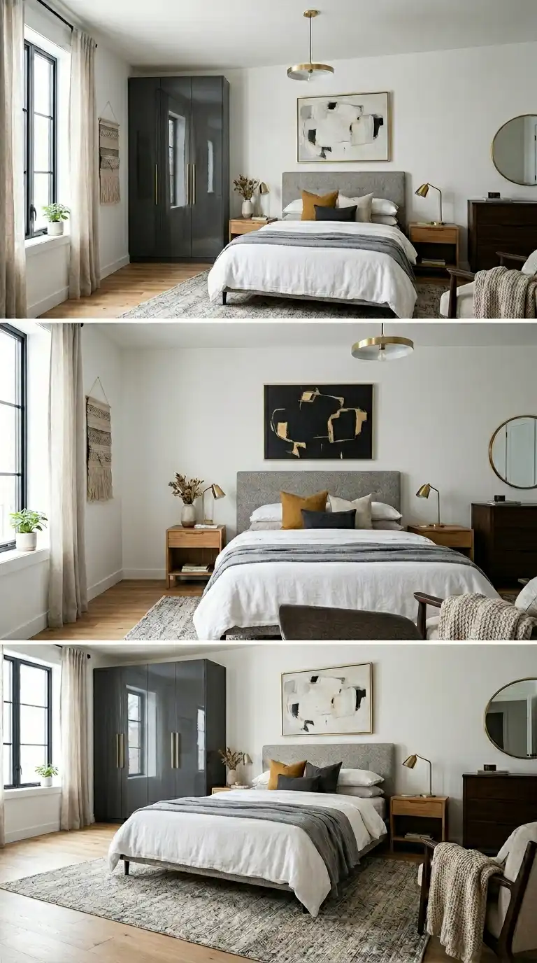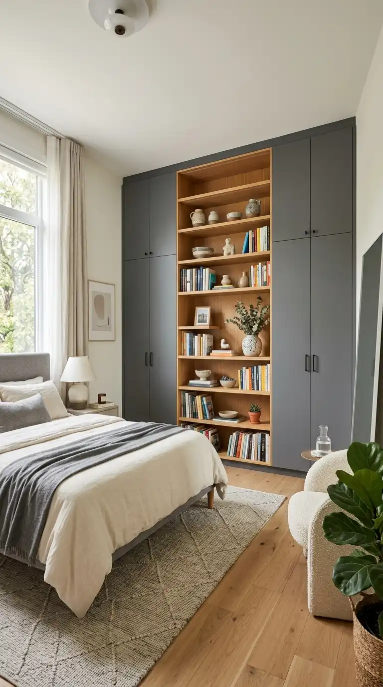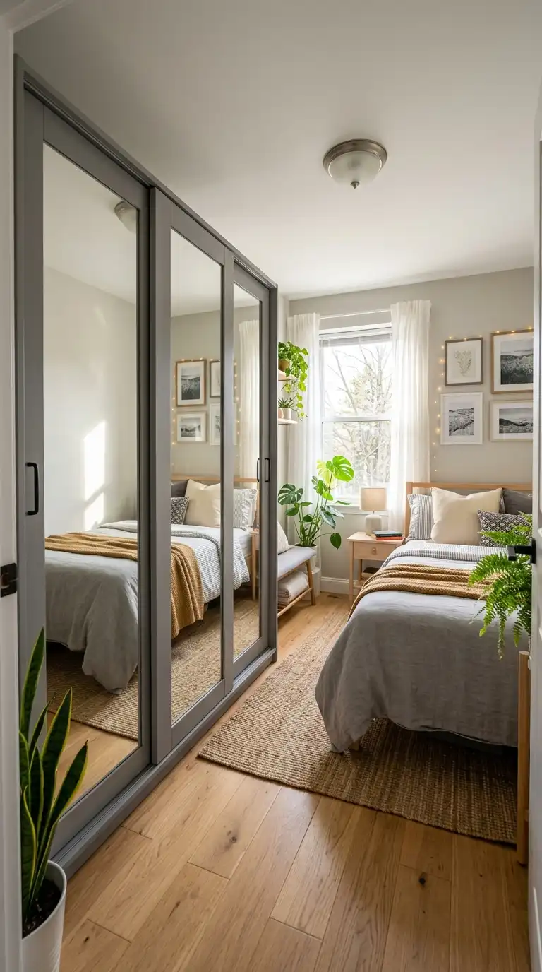 Incorporate mirror panels into a grey wardrobe to add functionality and reflect light. The mirrors break up the solid grey surface and make the room feel larger. Use mirrored panels on sliding doors or as accent sections.