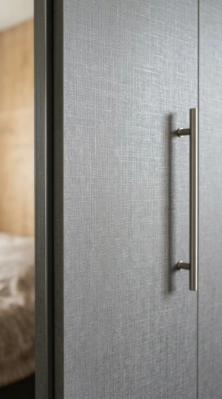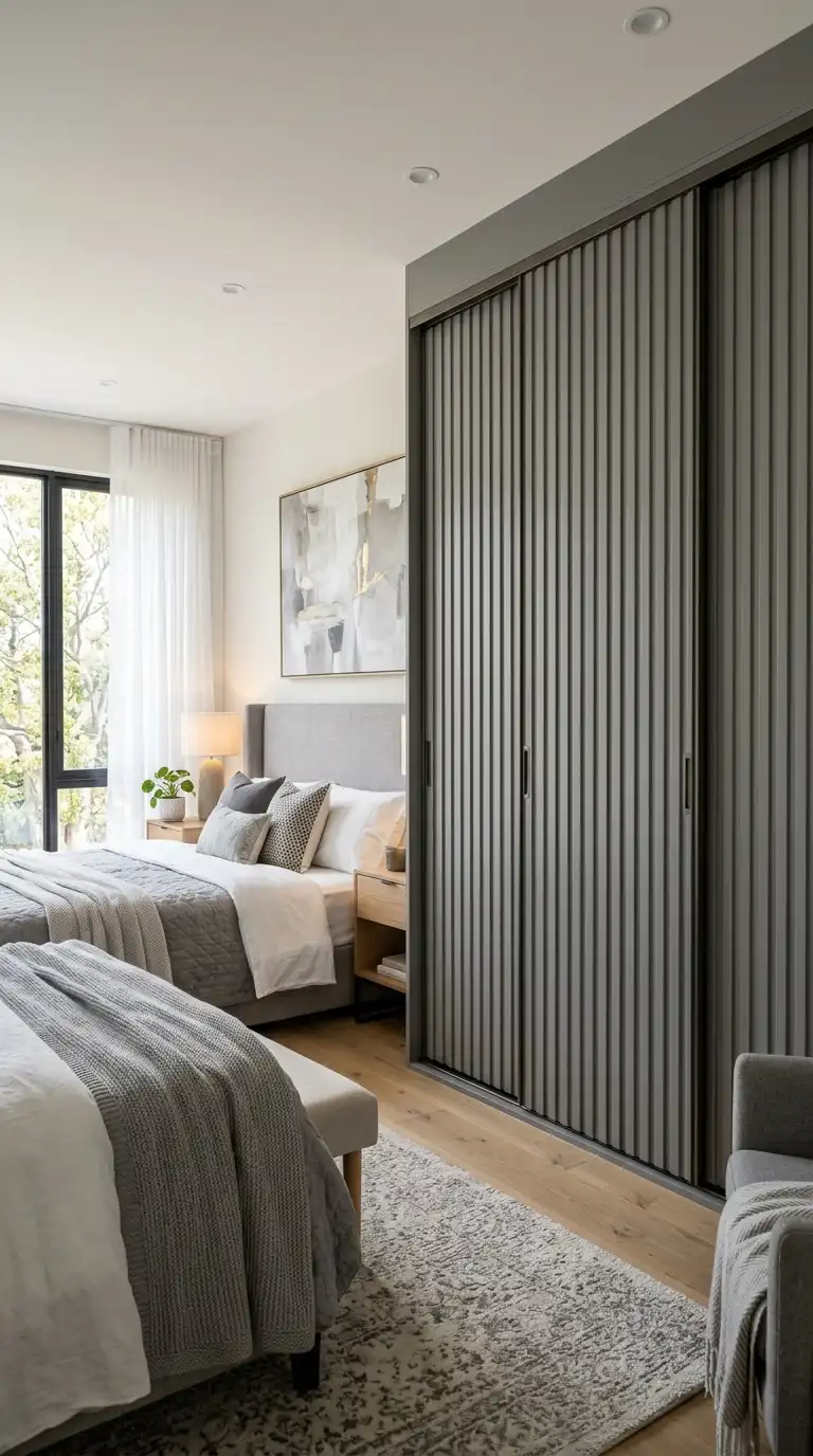 Fluted panels in a soft grey matte finish add texture and architectural interest to sliding wardrobe doors. The vertical grooves create rhythm and depth, catching light and casting subtle shadows. The sliding mechanism saves floor space.