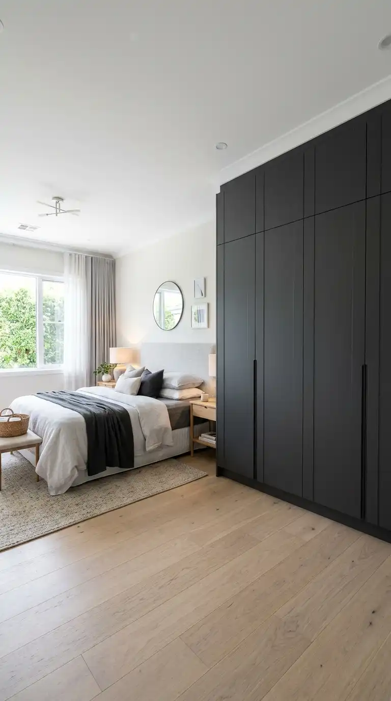 A dark grey matte floor-to-ceiling wardrobe creates a dramatic, sophisticated focal point. The deep, non-reflective finish absorbs light, creating a moody, intimate atmosphere. Pair with light walls and natural wood flooring for balance.