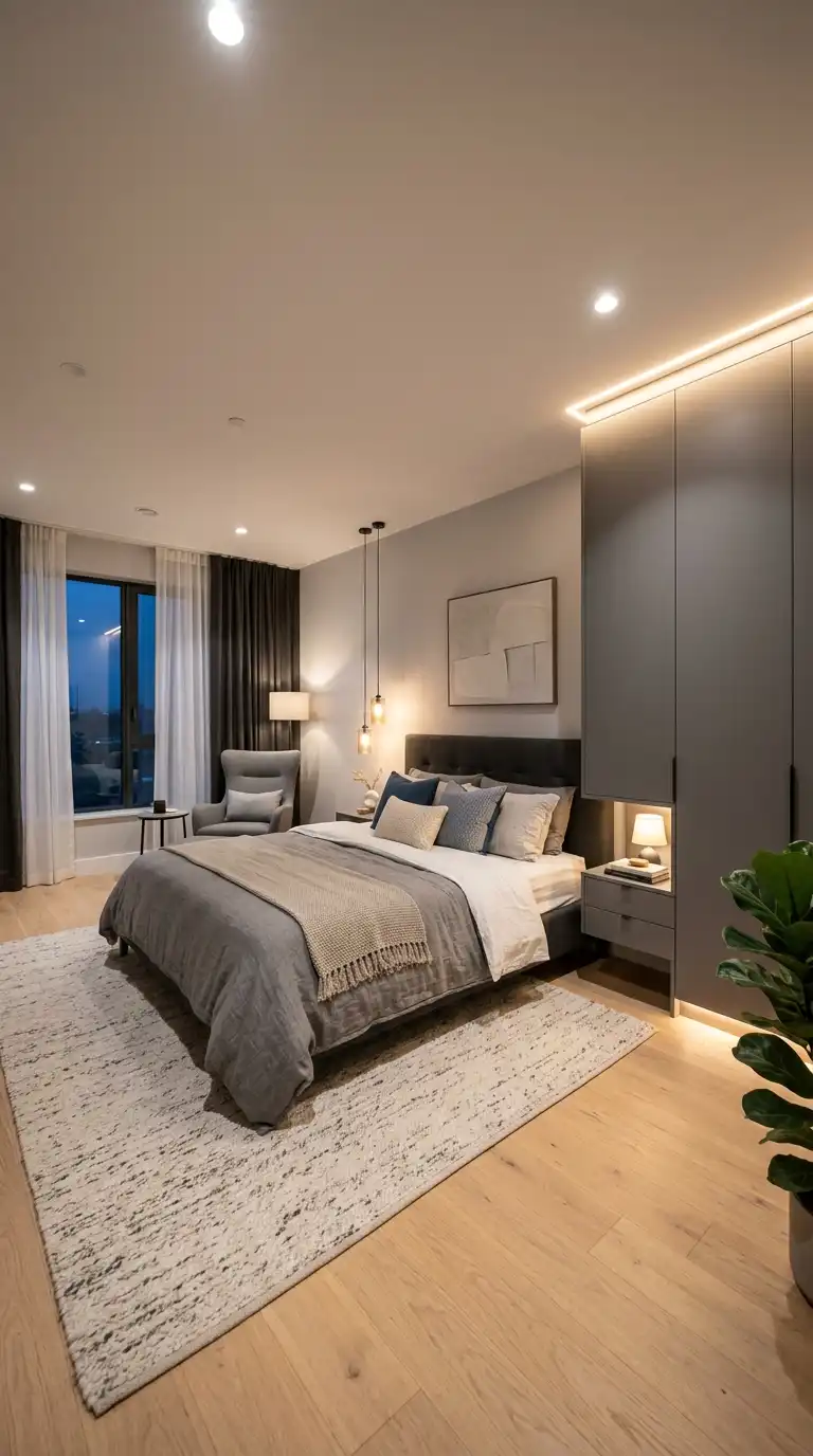 Add integrated LED lighting to a grey wardrobe to highlight the finish and create ambiance. Warm white LED strips along the top or inside shelves add a soft glow and make the wardrobe a striking focal point.