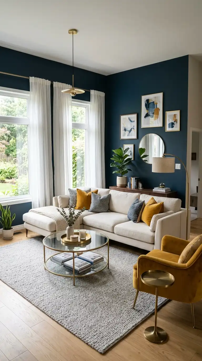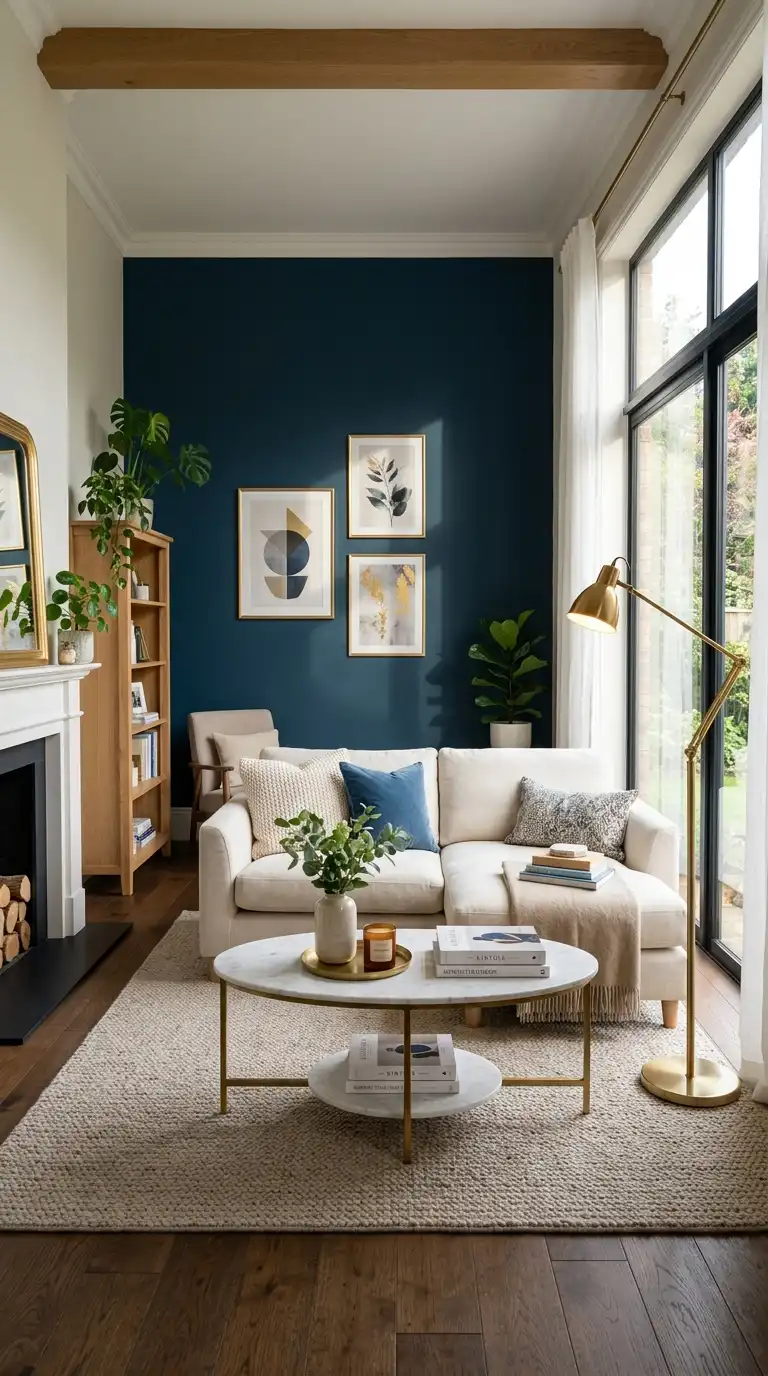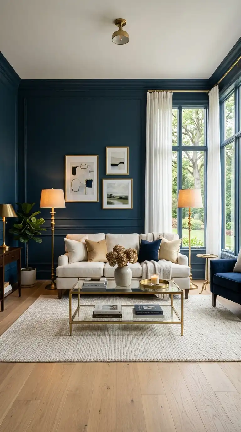 A Hague Blue accent wall creates instant drama without overwhelming the room. It serves as a stunning backdrop for neutral furnishings—cream sofas, light wood coffee tables, and beige area rugs. The contrast between the bold wall and soft furniture creates a balanced, sophisticated look. Add metallic accents in brass or gold to enhance the richness of the blue.