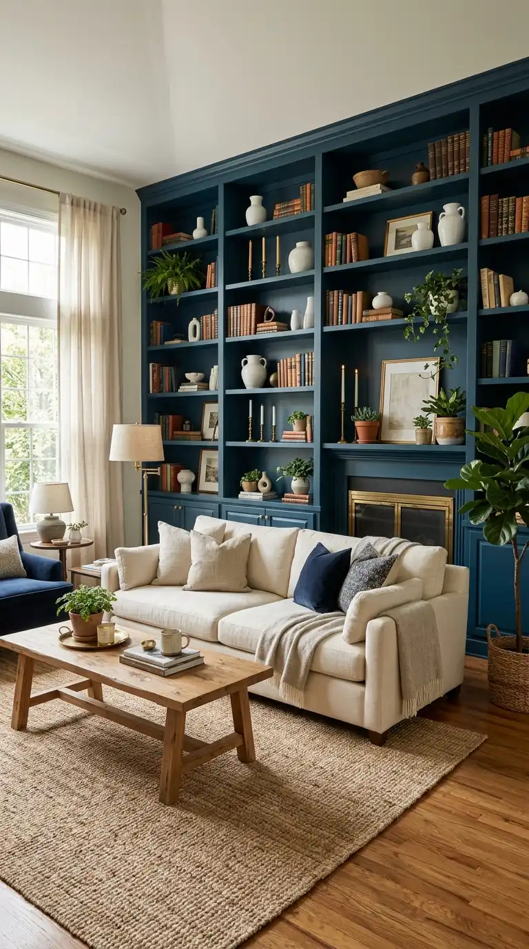 Built-in bookshelves painted in Hague Blue add architectural interest and a bold pop of color to a living room. The deep blue creates a stunning backdrop for displaying books, ceramics, and artwork. Style the shelves with a mix of white ceramics, brass accents, natural wood elements, and greenery to create contrast against the rich blue. Keep the surrounding walls in a soft neutral like cream or light gray to let the cabinetry stand out.