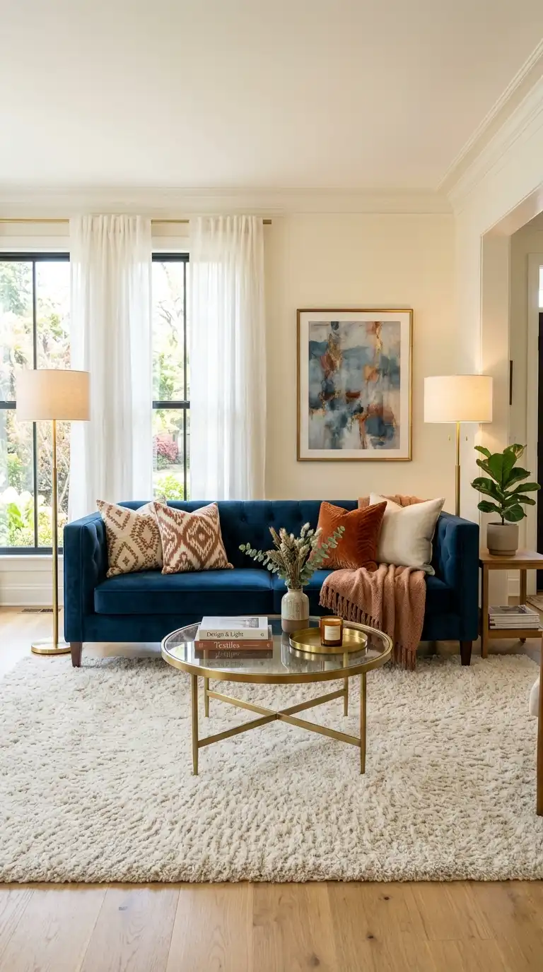 Cream, beige, and light gray upholstery provide soft, balanced contrast. Natural wood furniture in oak or walnut adds warmth. Blush pink, terracotta, and ochre yellow accent pieces create unexpected pops of color. Brass and gold finishes enhance the sophisticated feel.