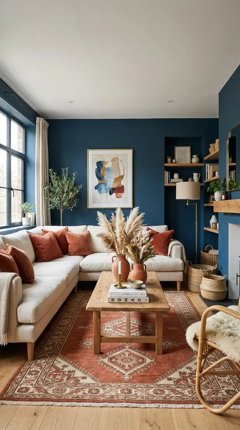 Hague Blue and terracotta create a warm, unexpected palette that feels both earthy and sophisticated. The cool depth of the blue balances the warm, rustic quality of terracotta, resulting in a space that feels grounded and inviting. Introduce terracotta through clay pots, a terracotta area rug, or rust-colored throw pillows. Natural wood furniture and woven textures enhance the organic feel of this combination.