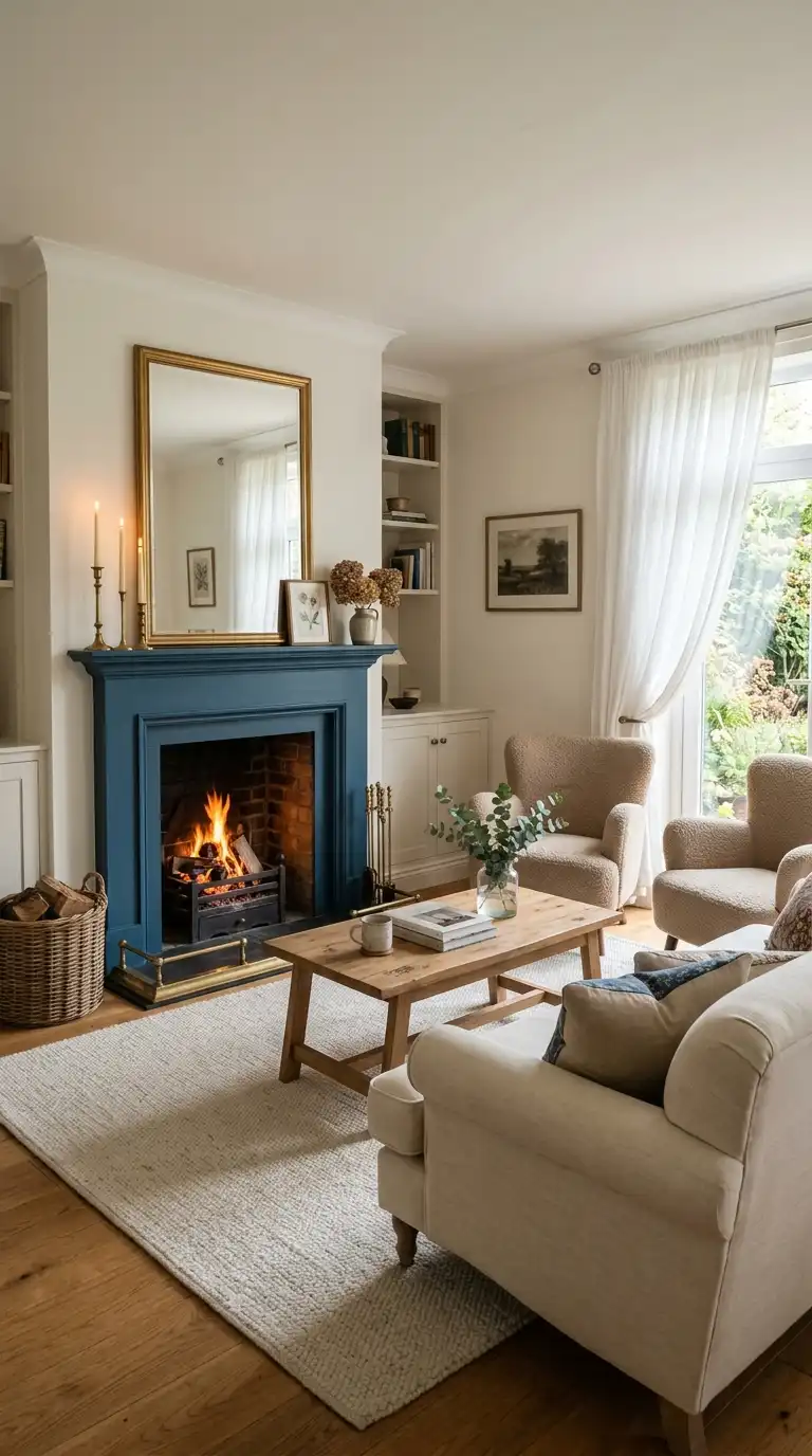 A fireplace surround painted in Hague Blue becomes an instant focal point in a living room. The deep blue draws attention to the hearth while adding character and historical charm. Keep the surrounding walls in a soft neutral like cream or pale gray, and style the mantel with brass candlesticks, a large mirror, and ceramic vases in complementary tones. A light area rug and neutral seating complete the balanced look.
