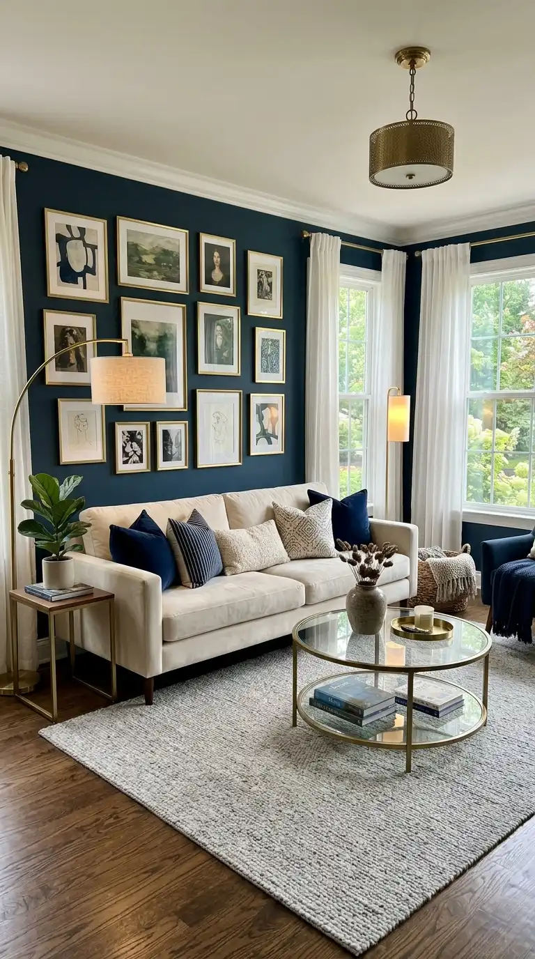 A gallery wall featuring brass frames against Hague Blue walls creates a stunning display of artwork and photographs. The deep blue backdrop makes brass frames pop, adding warmth and elegance to the space. Mix artwork in various sizes and styles—black and white photography, botanical prints, and abstract pieces—for a curated, collected look. Keep furniture neutral to let the gallery wall remain the focal point.