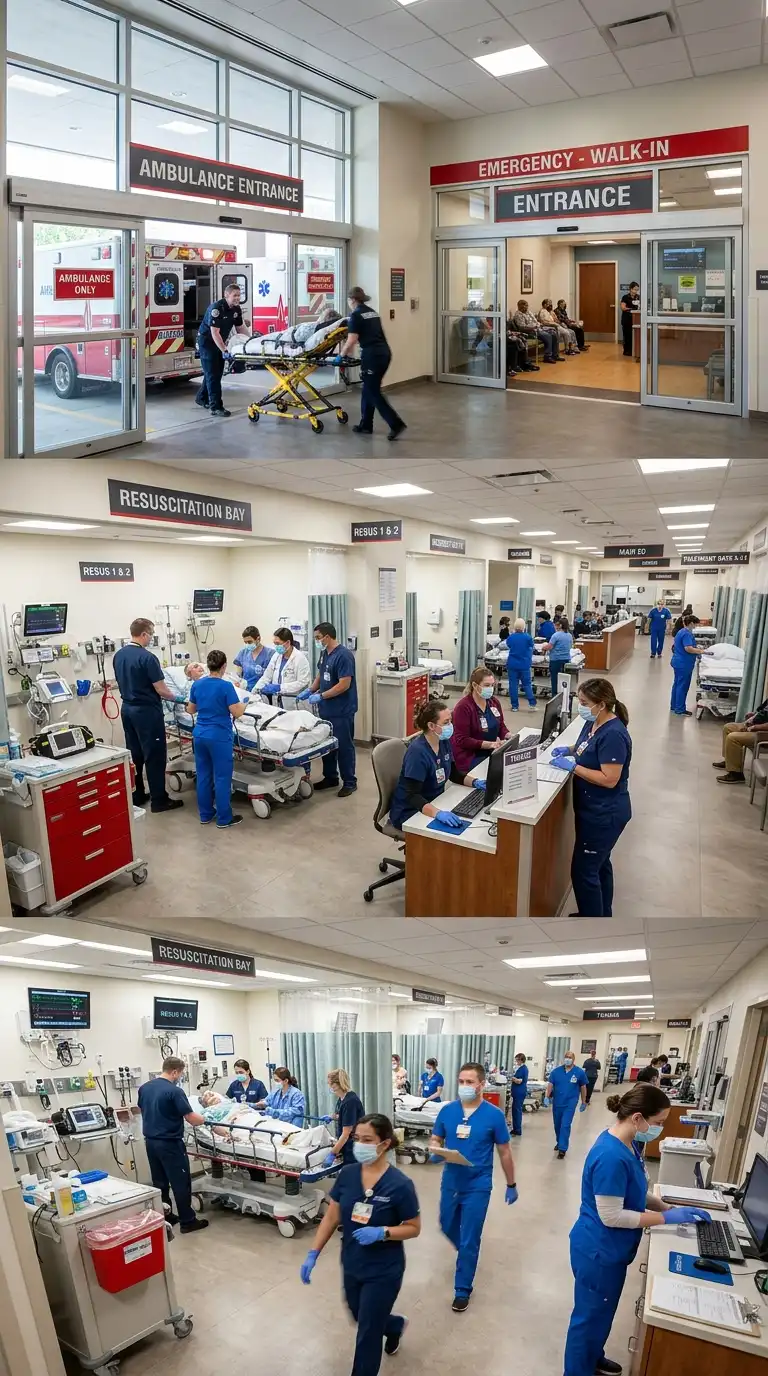 The emergency department is the front door of the hospital. It has a dedicated entrance for ambulances and a separate entrance for walk-in patients. The ED has triage, treatment rooms, a resuscitation bay, and a waiting area. The ED is fast, efficient, and organised.