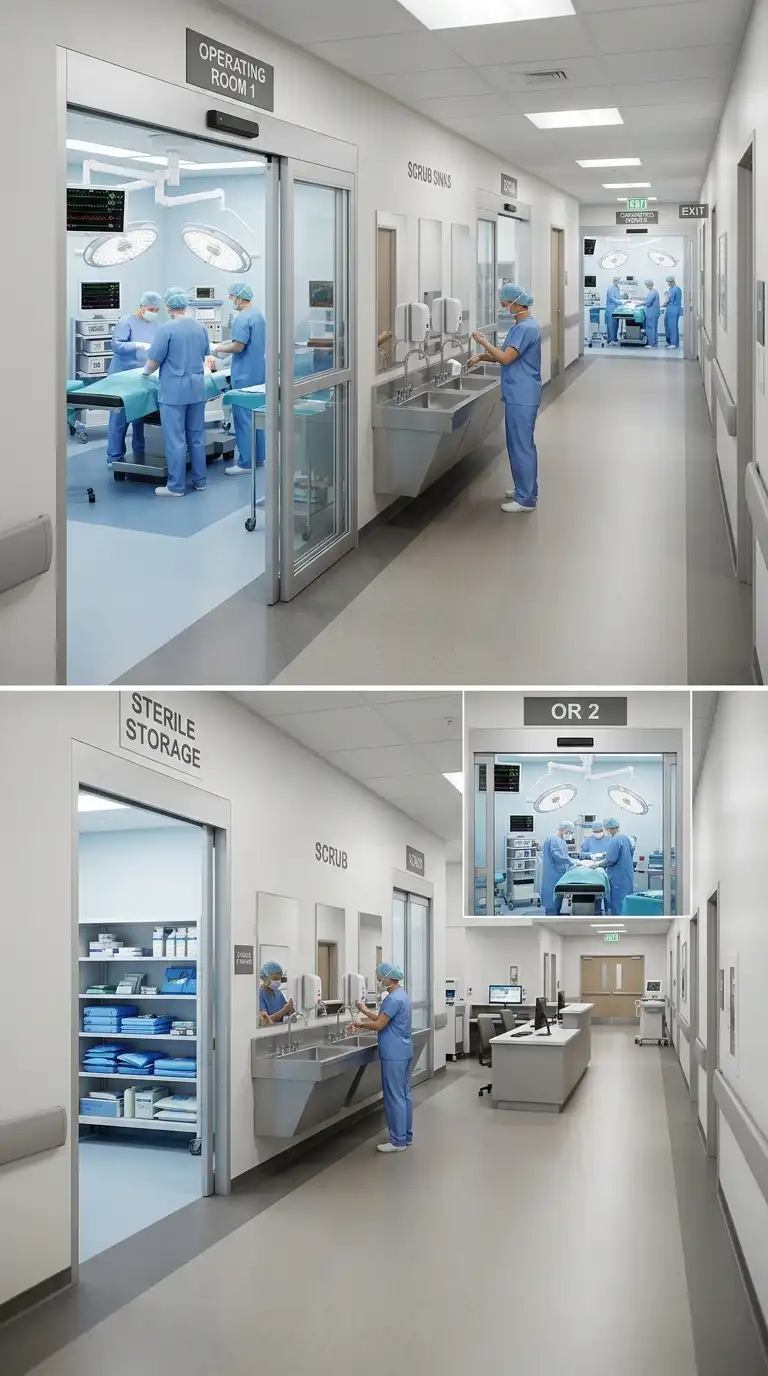 The operating suite is a cluster of operating rooms, scrub areas, and sterile storage. The operating rooms are large and windowless. The scrub area is between the ORs. The sterile storage is nearby. The operating suite is sterile, efficient, and high-tech.