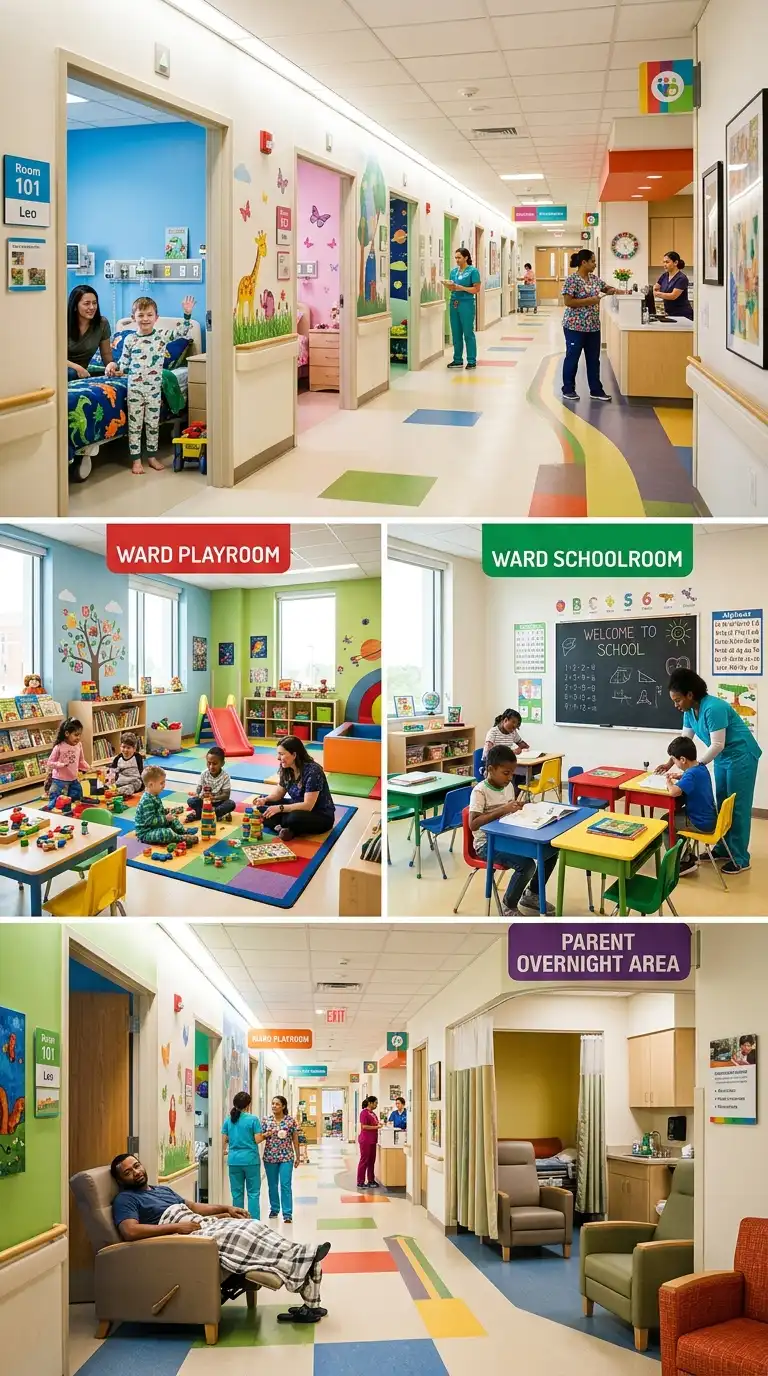 The paediatric ward is designed for children. The rooms are colourful and playful. The ward has a playroom, a schoolroom, and spaces for parents to stay. The paediatric ward is child-friendly, colourful, and family-centred.