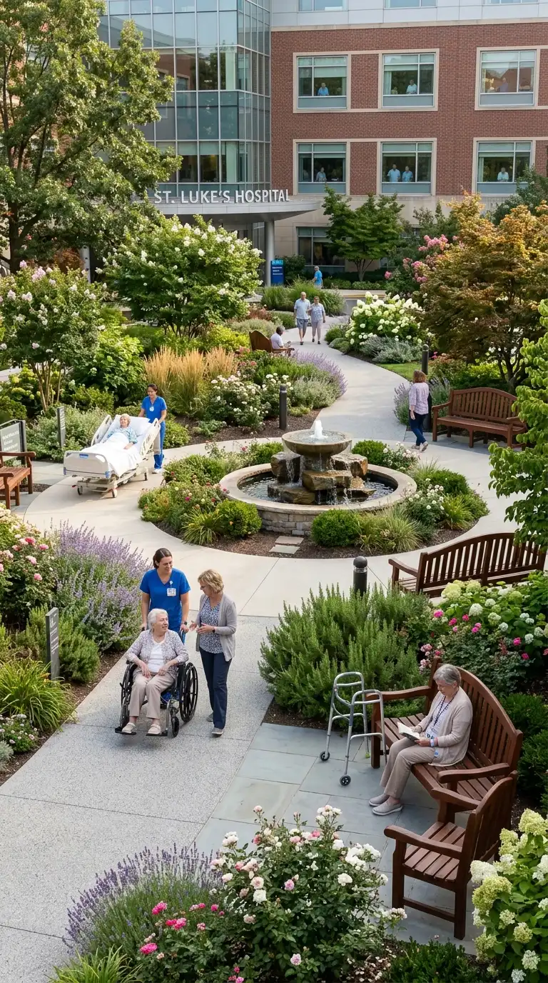 The healing garden is an outdoor space for patients, families, and staff. The garden has accessible paths, comfortable seating, shade, and plants. The healing garden reduces stress, lowers blood pressure, and speeds recovery. The healing garden is calm, restorative, and accessible.