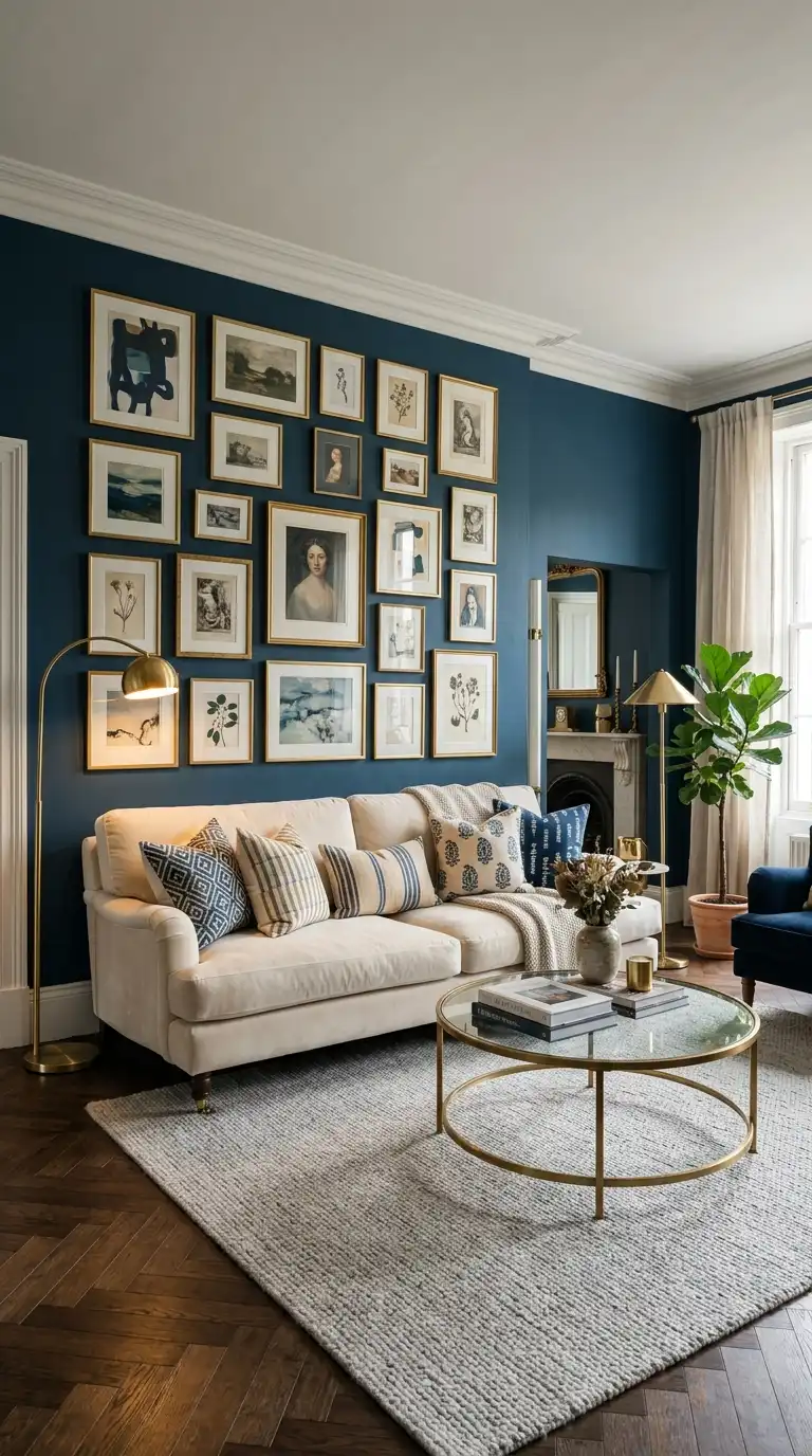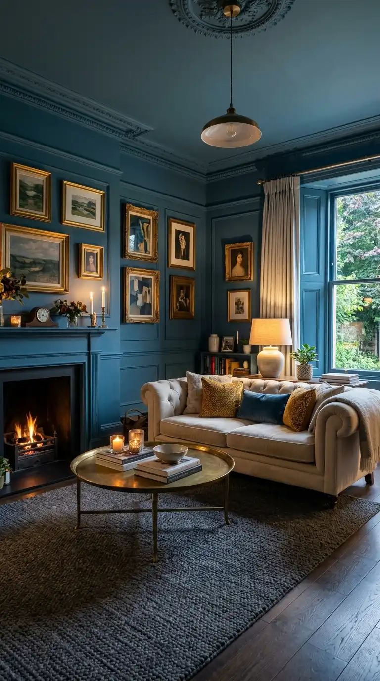 Inchyra Blue walls provide a dramatic, gallery-like backdrop for bold artwork. The deep, moody hue makes colors pop—whether you display vibrant abstracts, black and white photography, or gold-framed classical pieces . A gallery wall against Inchyra Blue becomes an instant focal point, transforming the living room into a sophisticated, art-filled space.