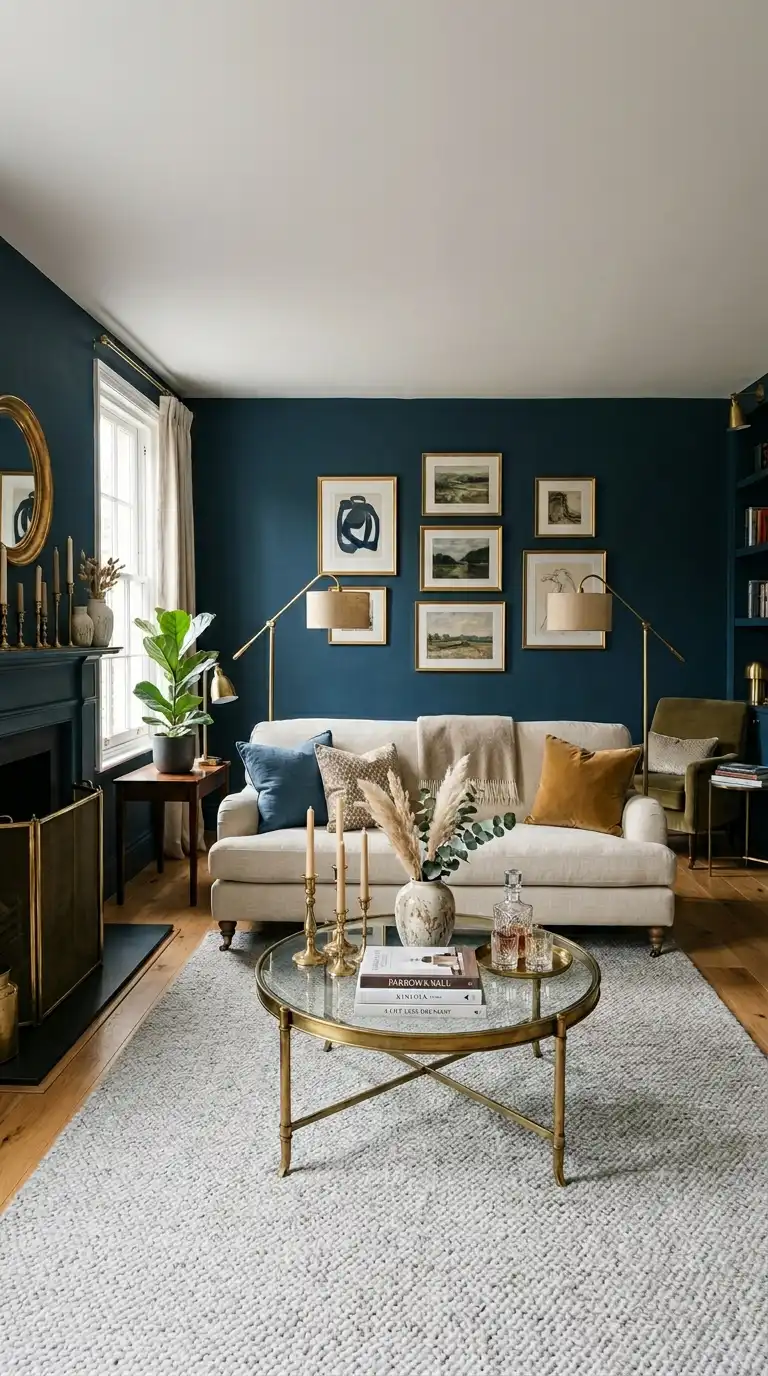 The cool depth of Inchyra Blue is beautifully offset by warm brass and gold accents. Metallic elements in light fixtures, coffee table bases, picture frames, and decorative accessories introduce warmth and reflect light, creating luminous focal points against the moody backdrop . Brushed gold or aged bronze finishes work particularly well with the blue-grey undertones of Inchyra Blue.