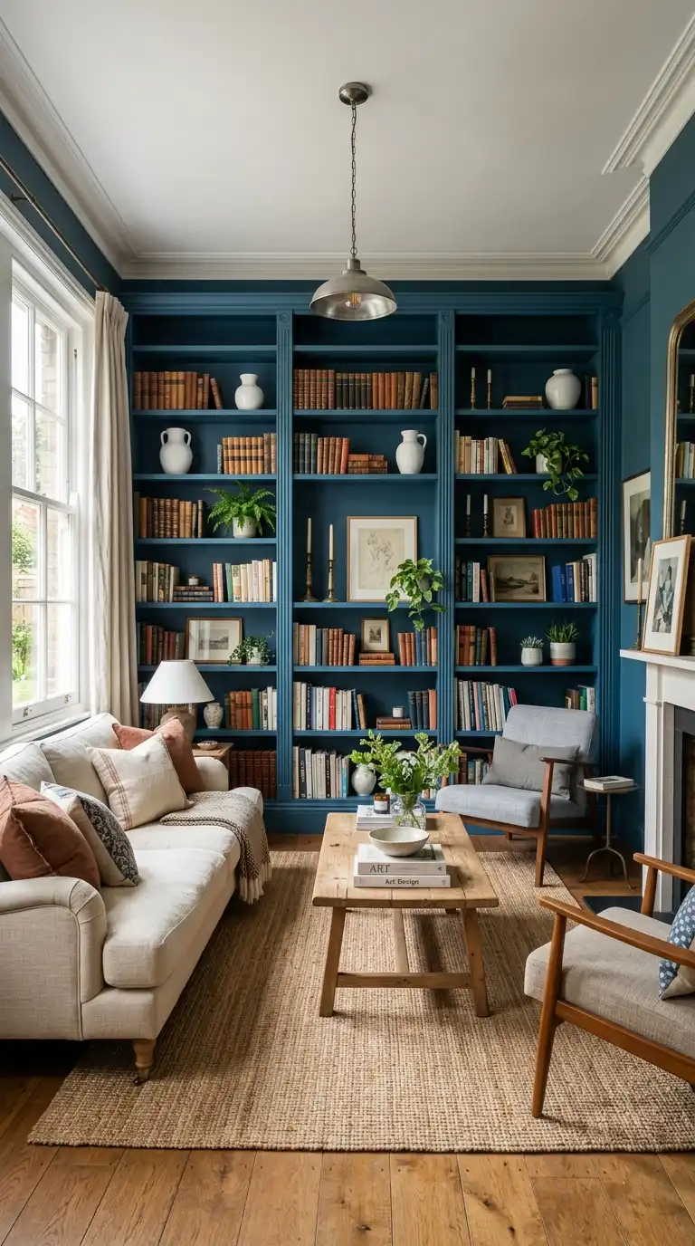 Built-in shelving painted in Inchyra Blue adds architectural interest and a sophisticated pop of color. The deep blue creates a stunning backdrop for displaying books, ceramics, and artwork. Style the shelves with a mix of white ceramics, brass accents, natural wood elements, and greenery to create contrast and visual depth. This approach works particularly well in Victorian or traditional homes .