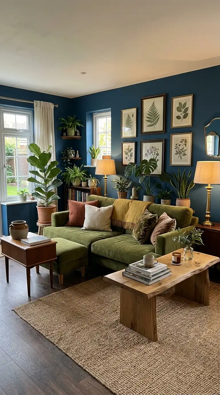 Inchyra Blue’s green undertones make it a natural companion for botanical-inspired schemes. Pair the deep blue-grey walls with an olive green sofa, lush plants, and botanical artwork for a scheme that feels organic and harmonious . This combination works beautifully in Victorian terraces and homes seeking a connection to nature.