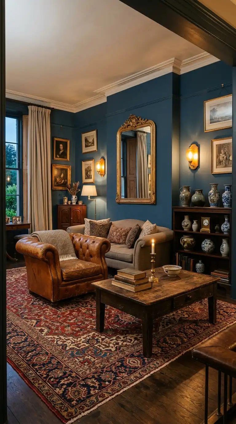 Inchyra Blue’s aged, historical quality makes it an ideal backdrop for antique and vintage furniture. The deep blue enhances the character of heirloom pieces, ornate woodwork, and vintage finds . Mix in pieces with patina—distressed wood, aged brass, and worn leather—to create a collected, lived-in look that feels both elegant and personal.