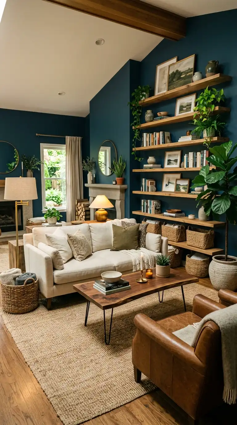 Natural wood elements bring warmth and organic texture to an Inchyra Blue living room. The deep blue-grey walls provide a dramatic backdrop for oak, walnut, or teak furniture, allowing the wood grain to shine. Use wood in coffee tables, shelving, flooring, or exposed ceiling beams to ground the space and balance the cool depth of the blue .
