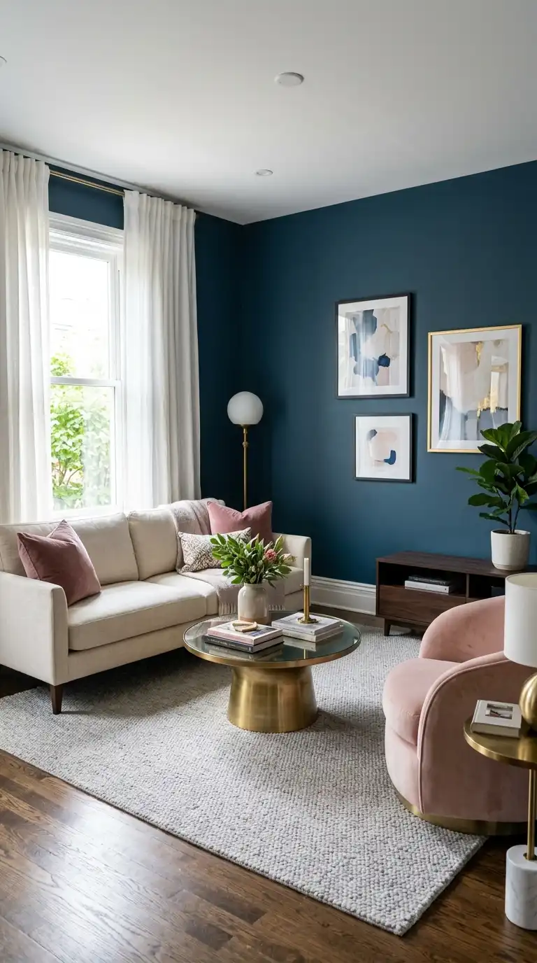 For an unexpected yet sophisticated palette, pair Inchyra Blue with dusky pink or blush accents. The cool depth of the blue balances the soft warmth of pink, creating a space that feels both elegant and inviting . Introduce pink through throw pillows, a velvet armchair, or artwork for a subtle pop of color.