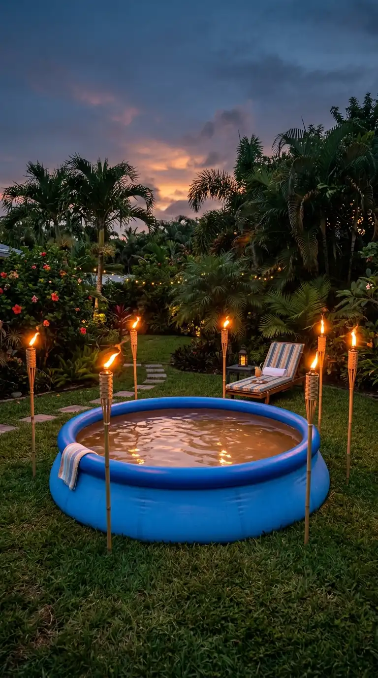 Define your inflatable pool area by lining the ground around it with tiki torches. Space them every 4–5 feet. Use citronella fuel to keep bugs away. At dusk, the torches create a ring of warm light that makes the pool feel like a resort, not a plastic ring in the grass.