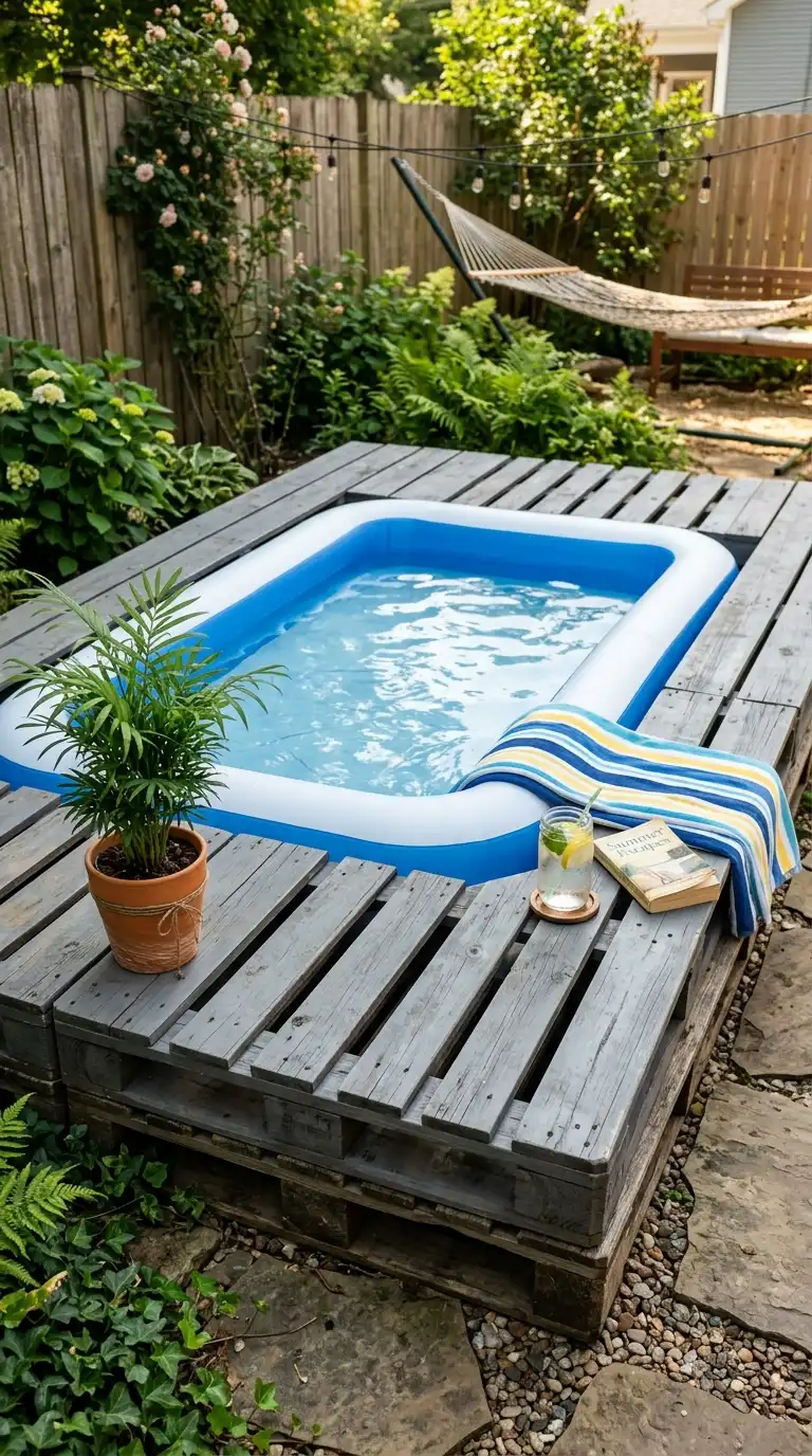 Build a low wooden deck around your inflatable pool using recycled pallets. Sand them smooth, seal them, and arrange them in a square or rectangle with a hole cut for the pool. The deck raises the pool slightly, gives you a place to step out onto dry wood, and hides the inflatable ring.