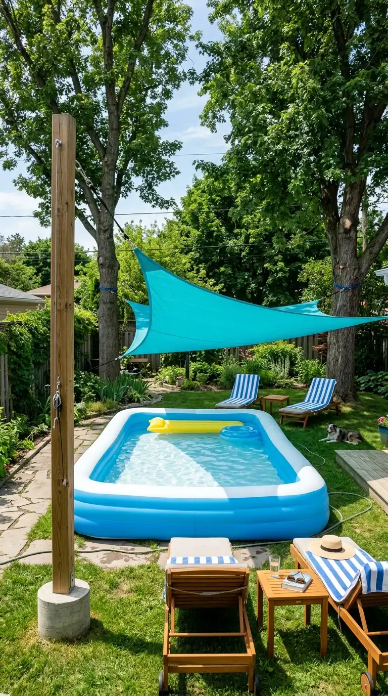 Inflatable pools have zero sun protection. Fix that by suspending a triangle shade sail directly over the pool. Anchor three corners to trees, fence posts, or heavy poles. Angle it to block the afternoon sun. The water stays cooler, and kids avoid sunburns during peak hours.