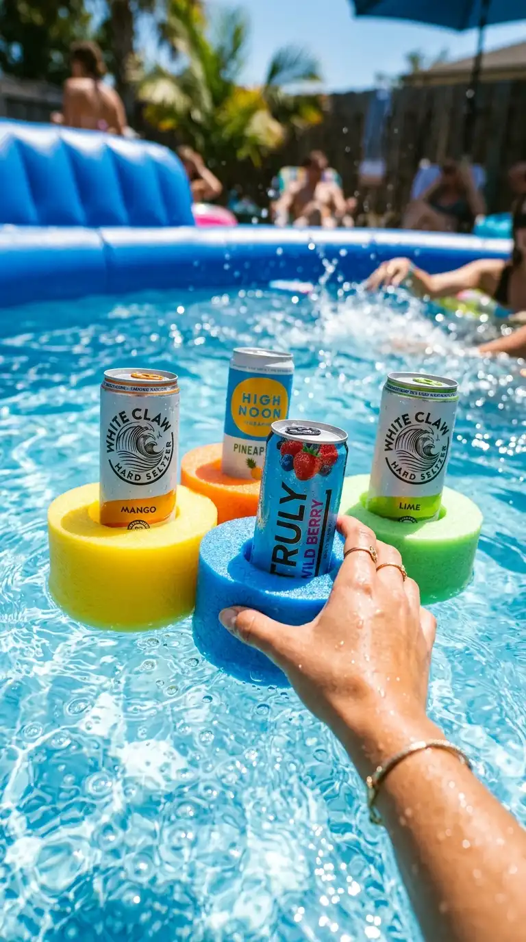 Keep drinks from tipping into the pool. Buy a set of floating drink holders (foam rings with mesh centers) or make your own from pool noodles and cup holders. Corral them together with a string so they float as a group. Everyone grabs their own can without leaving the water.