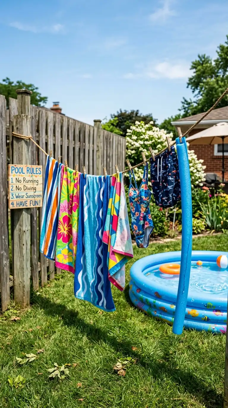 Stretch a clothesline between two trees, fence posts, or telescoping poles near your inflatable pool. Use clothespins to hang wet towels, swimsuits, and pool toys. Everything drips onto the grass instead of inside your house. The line also doubles as bunting or string light support.