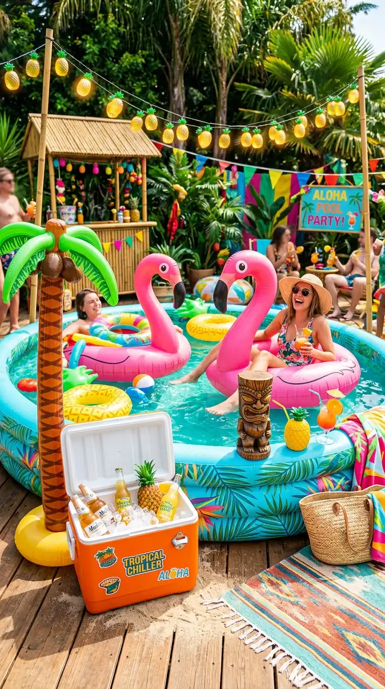 Pick a theme and go all in. For a tropical theme: inflatable flamingos, a tiki bar, and plastic palm trees. For a neon theme: glow sticks in the water, blacklights, and neon pool floats. For a retro theme: striped umbrellas, a vintage cooler, and old-school swim rings. The pool is the anchor; the theme is the memory.